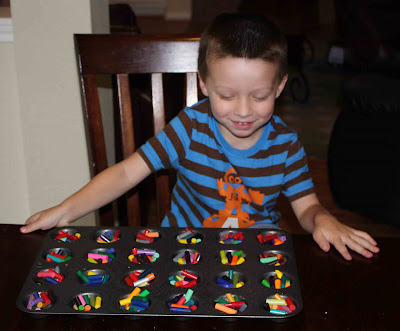 Step 1: Remove papers from the crayons and break into small pieces. Carter was such a great helper!!Step 2: Fill a mini muffin pan, sprayed well with Pam, with the crayon pieces. Fill each cup all the way to the top.Step 3: Bake in a 400 degree oven for 5 minutes. This is how they looked when I first pulled them out - VERY melty!Step 4: After cooling completely on the counter, pop them into the freezer for a few minutes so they come out of the muffin pan easily. Voila! Funky new round crayons!! :-)